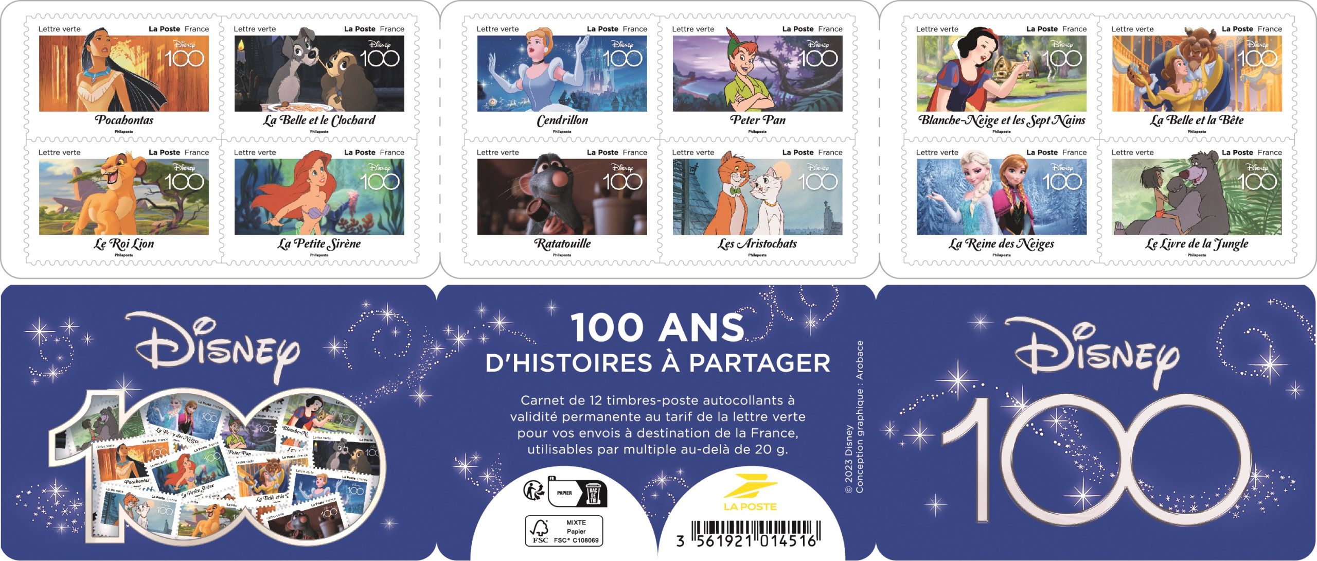La Poste émet un carnet de 12 timbres-poste à l’occasion du 100ème anniversaire de The Walt Disney Company illustré par 12 personnages emblématiques.