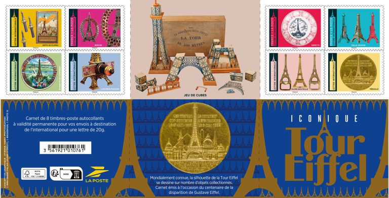 En cette année centenaire de la disparition de Gustave Eiffel, La Poste émet un carnet de 8 timbres-poste autocollants, intitulé « Iconique Tour Eiffel », qui reprend des photographies d’objets anciens et d’exception.