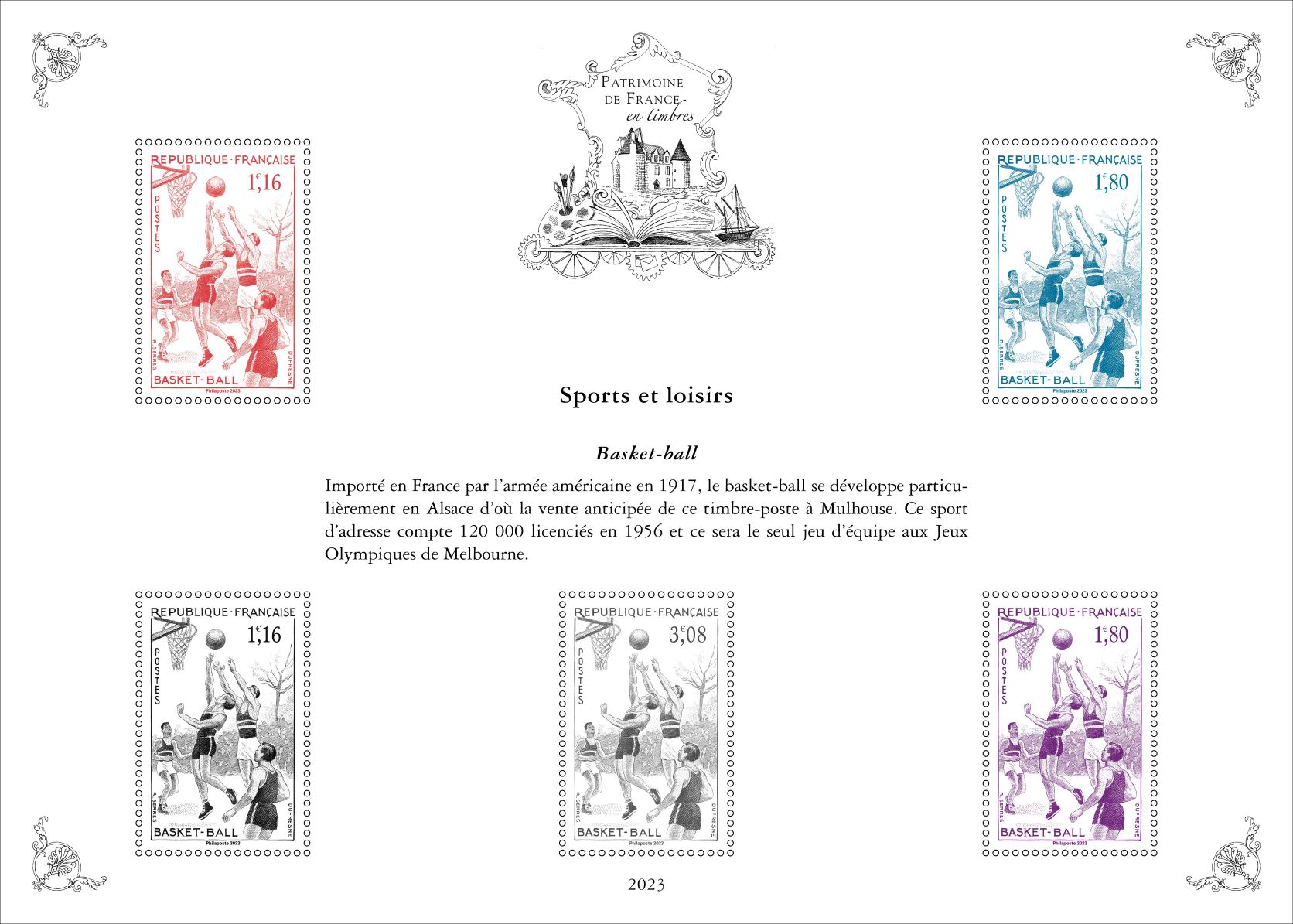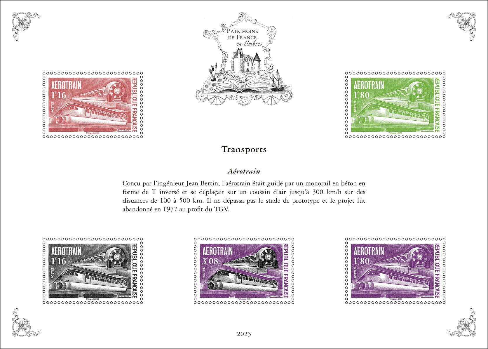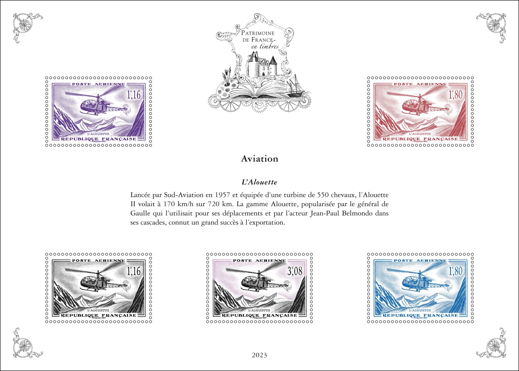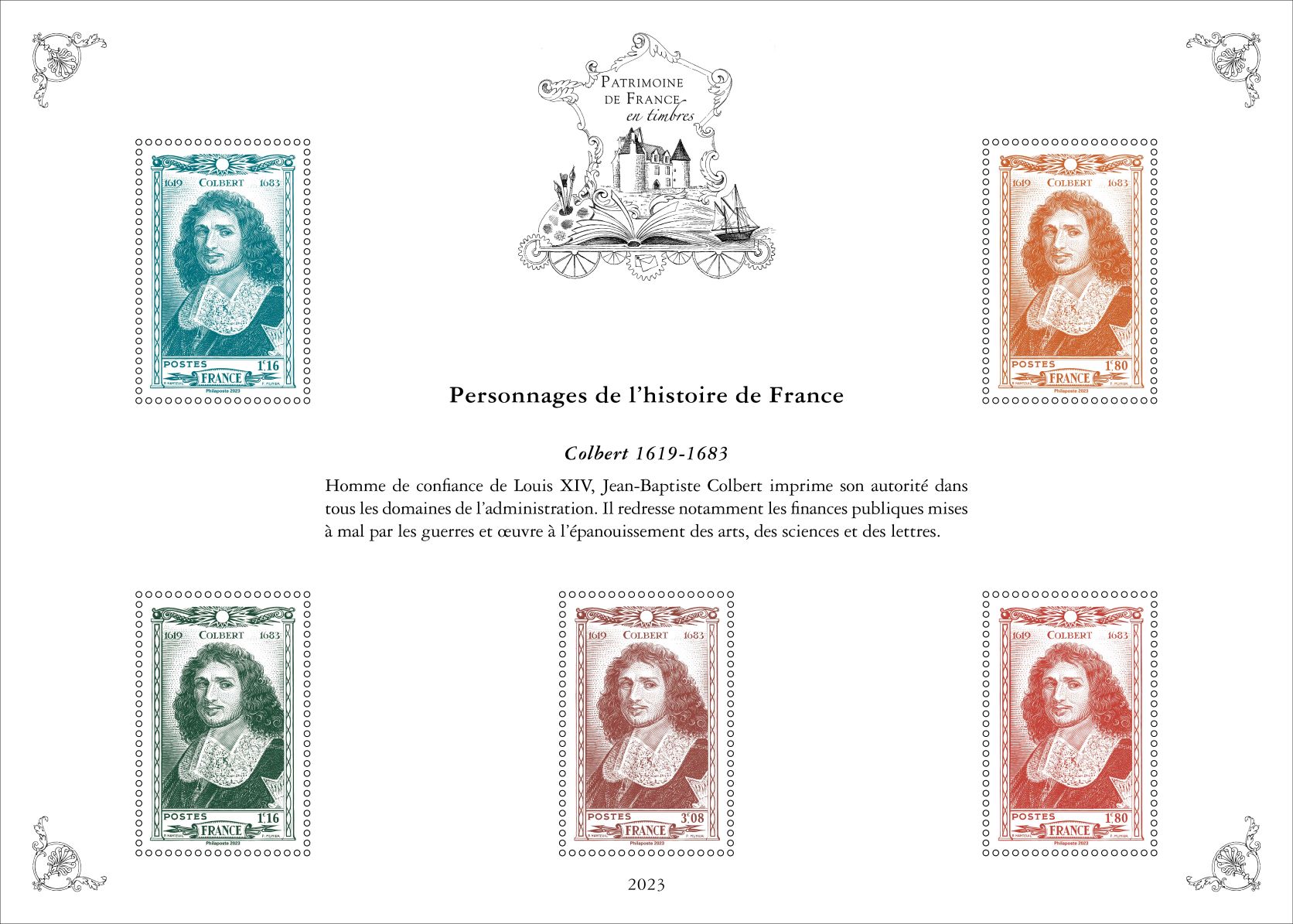 Pour la cinquième et dernière année , la série « Patrimoine de France en timbres » inscrite sur 5 ans, présente dix feuillets qui reprennent dix timbres, choisis par un comité d’experts, au travers de dix thématiques : Arts et lettres, Aviation, Croix-Rouge, La France de nos régions, Histoire postale, Personnages de l’Histoire de France, Patrimoine architectural de la France, Sciences et techniques, Sports et loisirs et Transports.