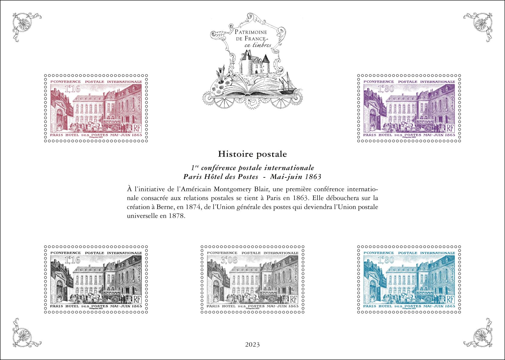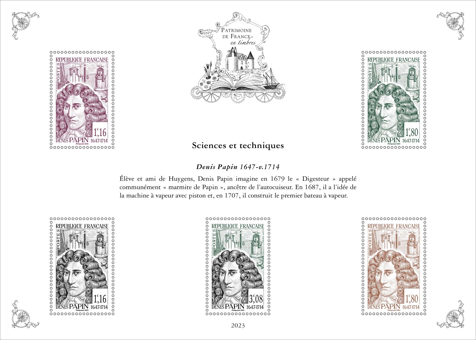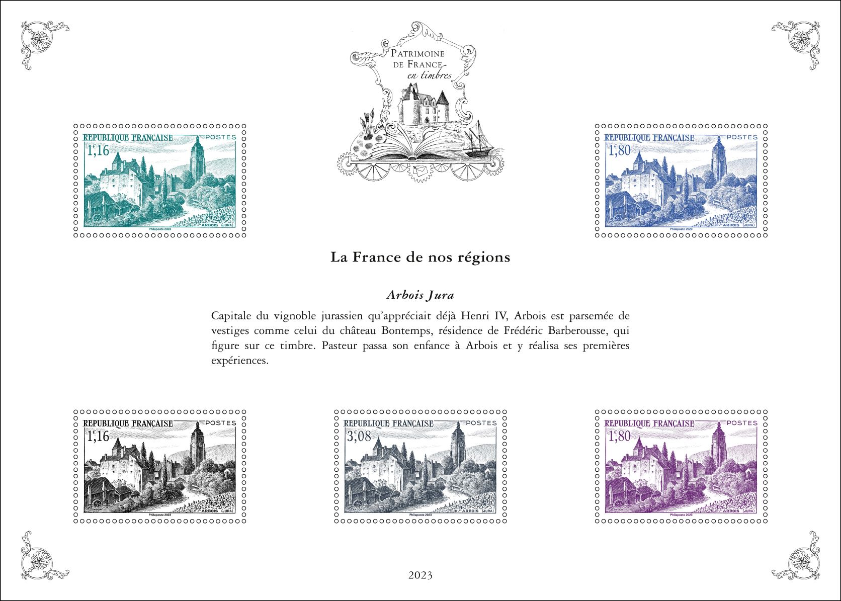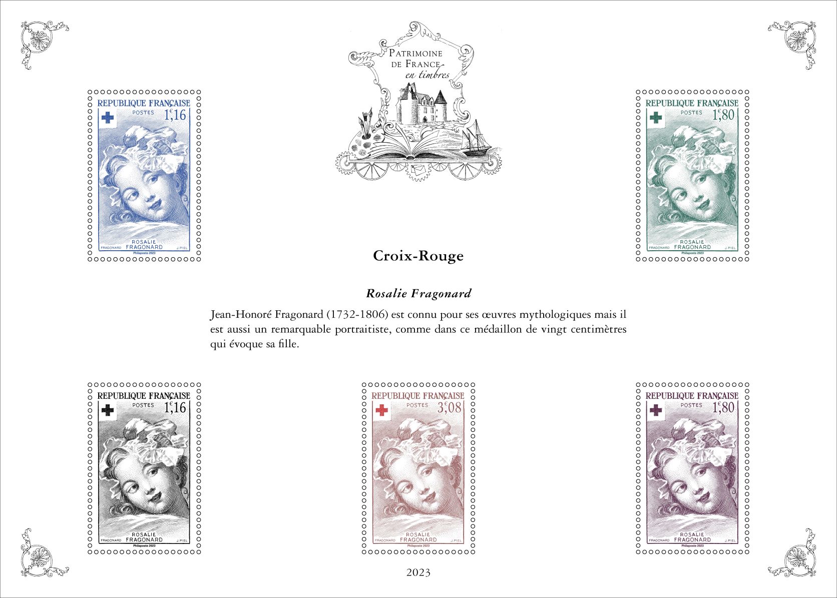 Pour la cinquième et dernière année , la série « Patrimoine de France en timbres » inscrite sur 5 ans, présente dix feuillets qui reprennent dix timbres, choisis par un comité d’experts, au travers de dix thématiques : Arts et lettres, Aviation, Croix-Rouge, La France de nos régions, Histoire postale, Personnages de l’Histoire de France, Patrimoine architectural de la France, Sciences et techniques, Sports et loisirs et Transports.