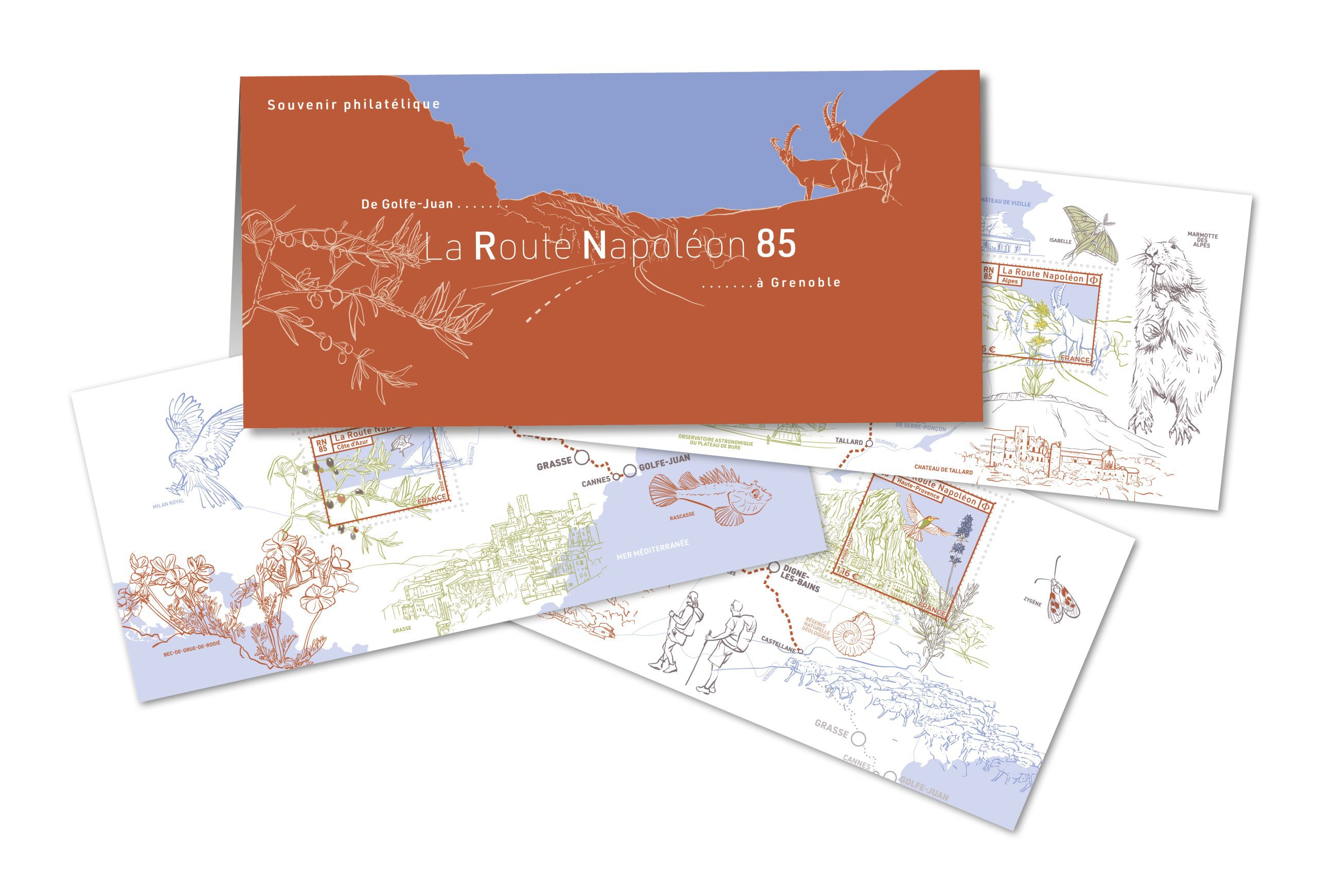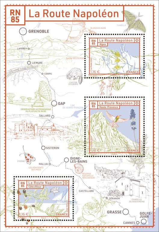 La Poste émet un bloc de 3 timbres sur la Route Napoléon qui traverse 4 départements et 2 régions, mettant en exergue les caractéristiques naturelles, géologiques, la faune et la flore des paysages de la Côte d’Azur, de la Haute-Provence et des Alpes.