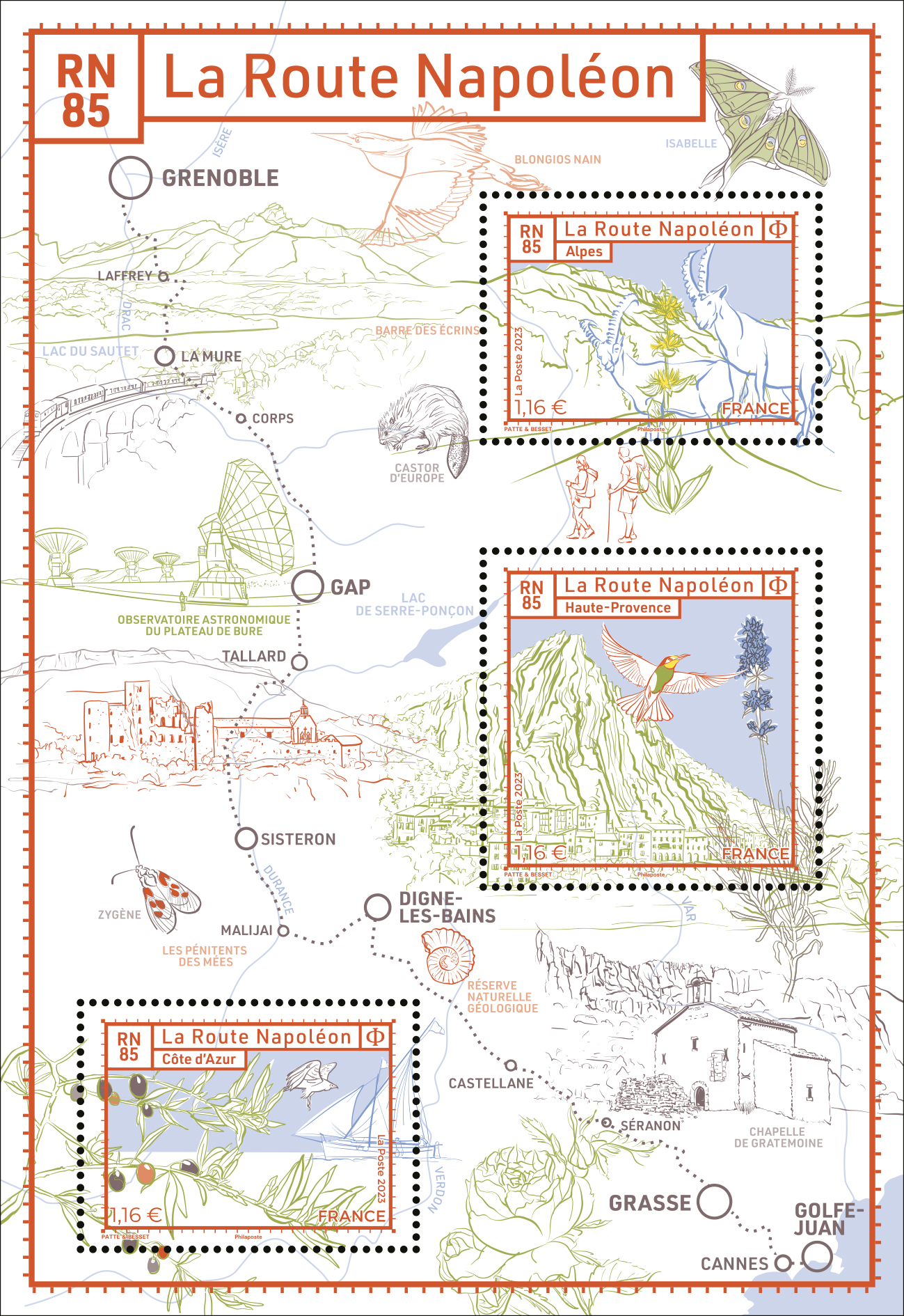 Inscrit dans la catégorie « Nature et environnement » du programme philatélique de l’année 2023, le bloc « La Route Napoléon » déroule des paysages multiples au gré de la route mythique traversant 4 départements (Alpes-Maritimes, Alpes de Haute Provence, Hautes Alpes et Isère) et 2 régions (PACA et Auvergne – Rhône – Alpes). De part et d’autre, elle offre à voir les structures naturelles et géologiques, la faune et la flore ainsi que des magnifiques paysages. De Golfe Juan jusqu’à Grenoble ce sont autant de haltes pour admirer, observer, goûter et se divertir.