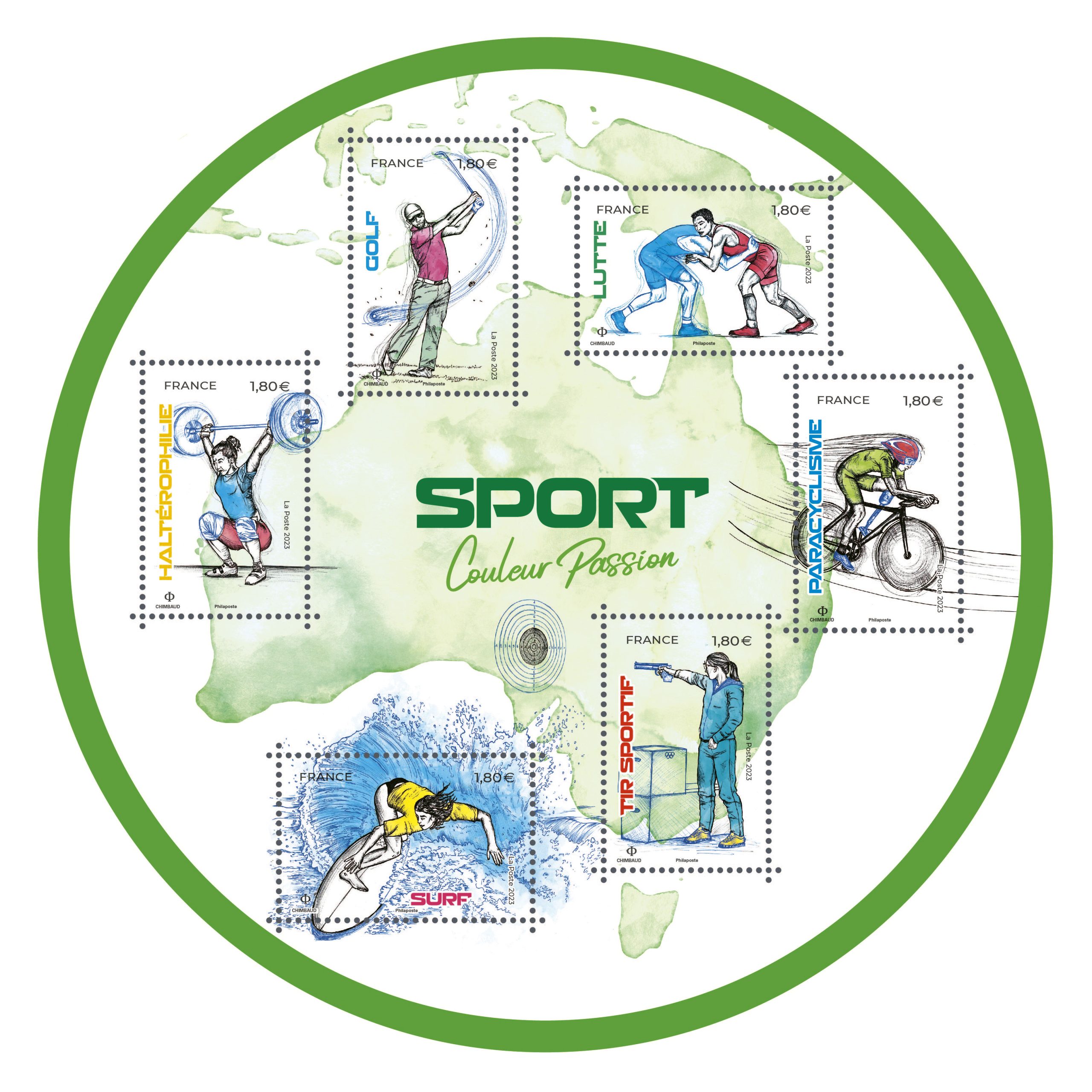 La Poste émet un bloc rond de la série « Sport Couleur Passion ». Après le continent européen, le continent américain, le continent asiatique, le continent africain, c’est l’Océanie qui est mise à l’honneur avec, le golf, la lutte,l’haltérophilie, le surf, le tir sportif et le paracyclisme.