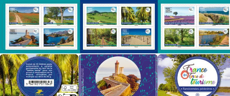 La Poste émet un carnet de 12 timbres-poste, illustré par des photographies de sentiers ou chemins de randonnées représentatifs de La France.