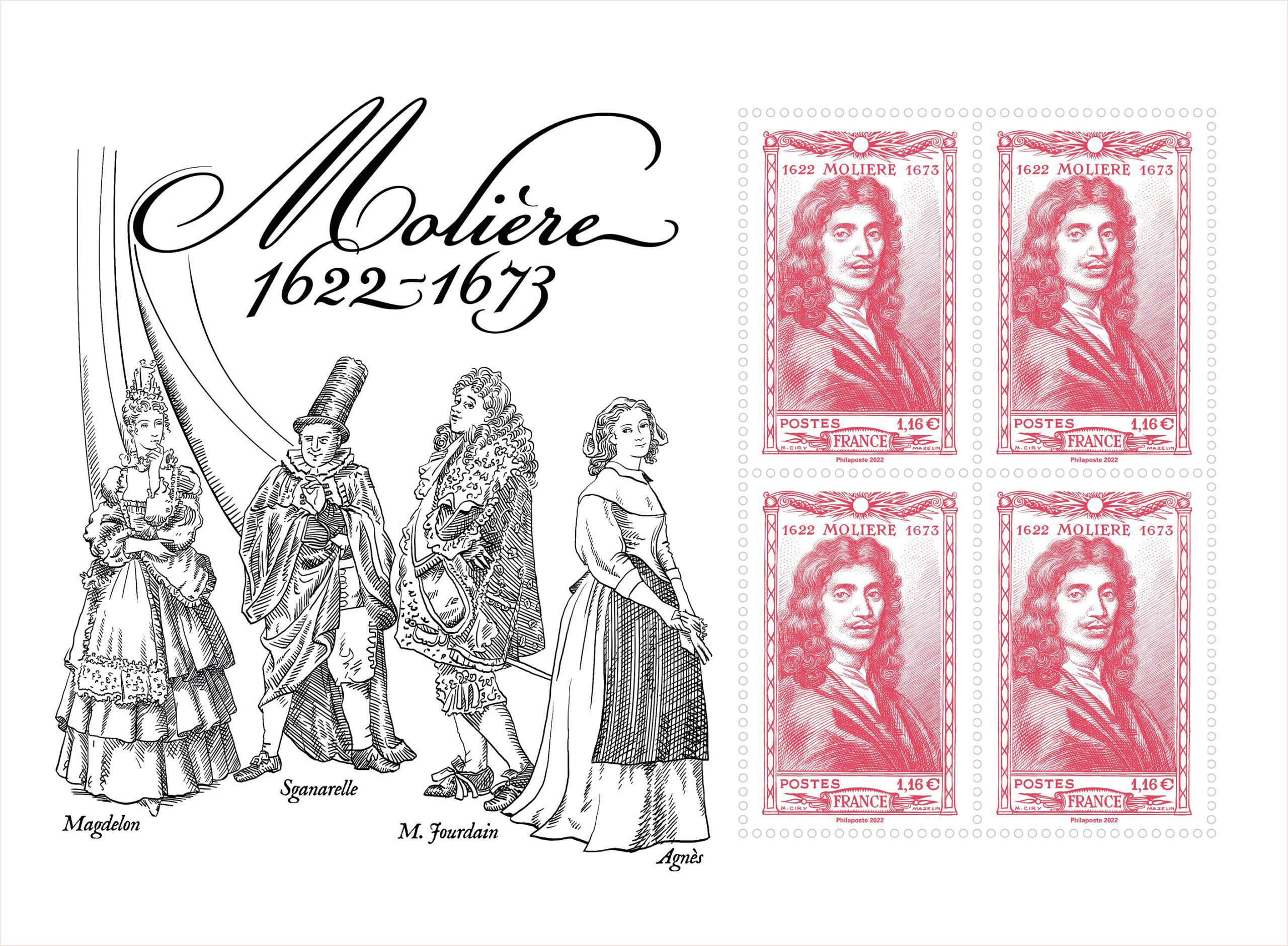 Un bloc spécial est imprimé en taille douce sur lequel quatre exemplaires du timbre Molière émis en 1944 sont reproduits. Les timbres sont accompagnés d’illustrations de quatre des personnages de comédie, de gauche à droite, Magdelon (Les Précieuses ridicules, 1659), Sganarelle (Le Médecin malgré lui, 1666), M. Jourdain (Le Bourgeois gentilhomme, 1670), Agnès (L’École des femmes, 1662).