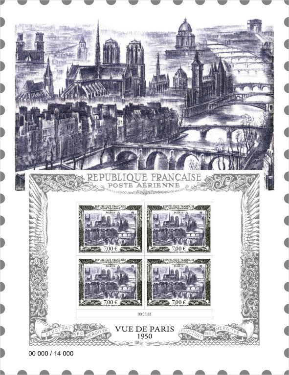 La série d’affiches, inaugurée en 2021 se poursuit. Après avoir rendu hommage à « Marianne l’engagée » en novembre 2021, puis au timbre « Burelé » en juin 2022, La Poste lance une 3ème affiche numérotée et datée, dédiée au timbre de la poste aérienne « Vue de Paris » de 1950. Elle comprend 4 timbres originaux spécialement émis pour le Salon philatélique d’automne.