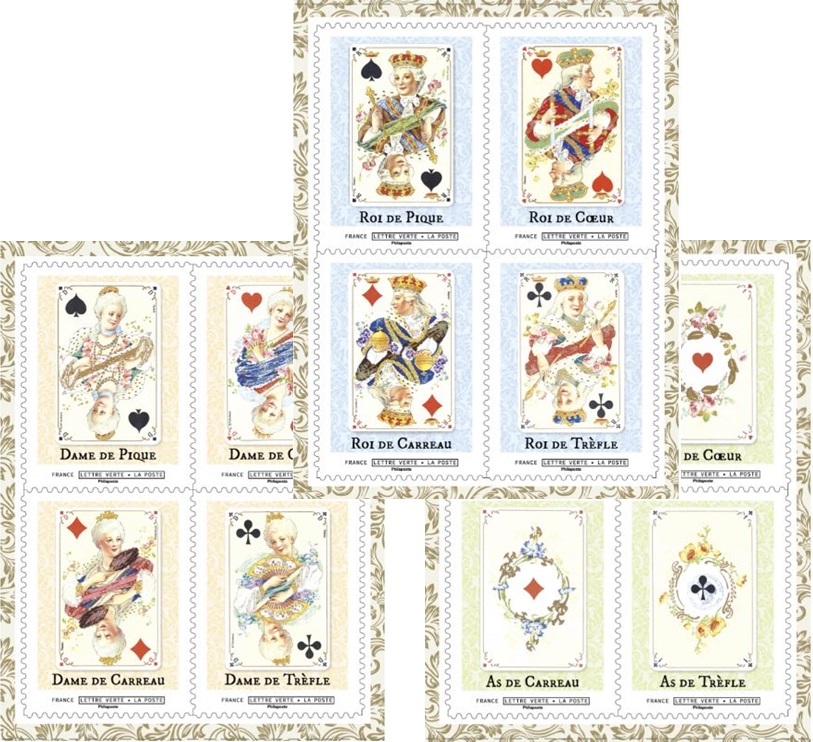 La Poste émet un carnet de collection de 12 timbres-poste autocollants, illustré de 12 cartes à jouer du jeu de whist, collection Louis XV de la maison Grimaud.