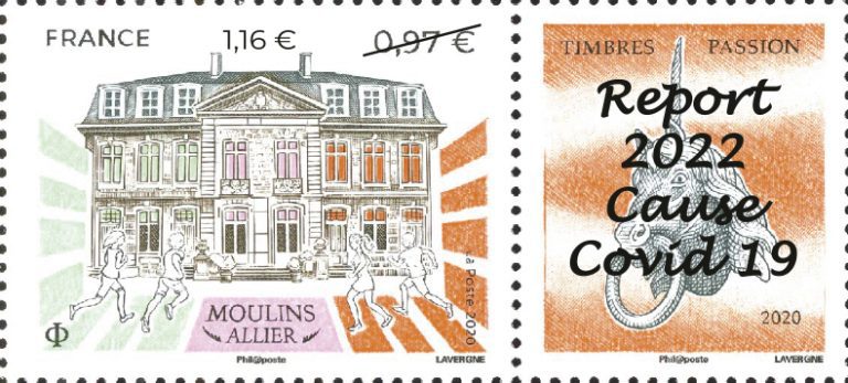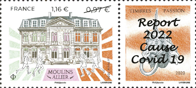 Le timbre « Moulins Allier – Timbrees-passion » a été émis à 500 000 exemplaires le 30 octobre 2020 pour la manifestation Timbres->Passion qui a été annulée en raison de la Covid et reportée du 28 au 30 octobre 2022. Le choix a été fait de surcharger les timbres Moulins 2020 encore en stock. La valeur faciale 0,97€ (tarif postal 2020) a été biffée pour être remplacée par la valeur faciale 1,16€ (tarif postal 2022). La surcharge sur la vignette (report 2022 cause Covid 2019) attenante du timbre a été proposée par la FFAP.