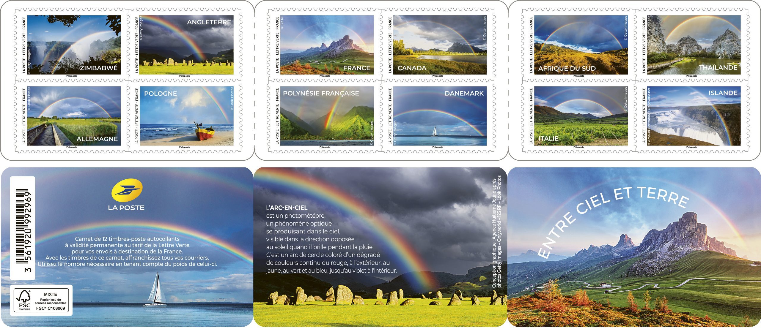 Ce carnet de 12 timbres-poste autocollants « Entre Ciel et Terre » est illustré par des photographies de paysages d’arcs-en-ciel au Zimbabwe, en Angleterre, en France, au Canada, en Afrique du Sud, en Thaïlande, en Allemagne, en Pologne, en Polynésie française, au Danemark, en Italie et en Islande.