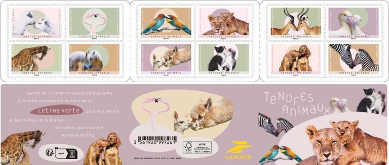 Ce carnet de 12 timbres-poste autocollants « Tendres Animaux » est illustré par des animaux qui expriment beaucoup de douceur et de tendresse, à l’image des couleurs pastel utilisées.