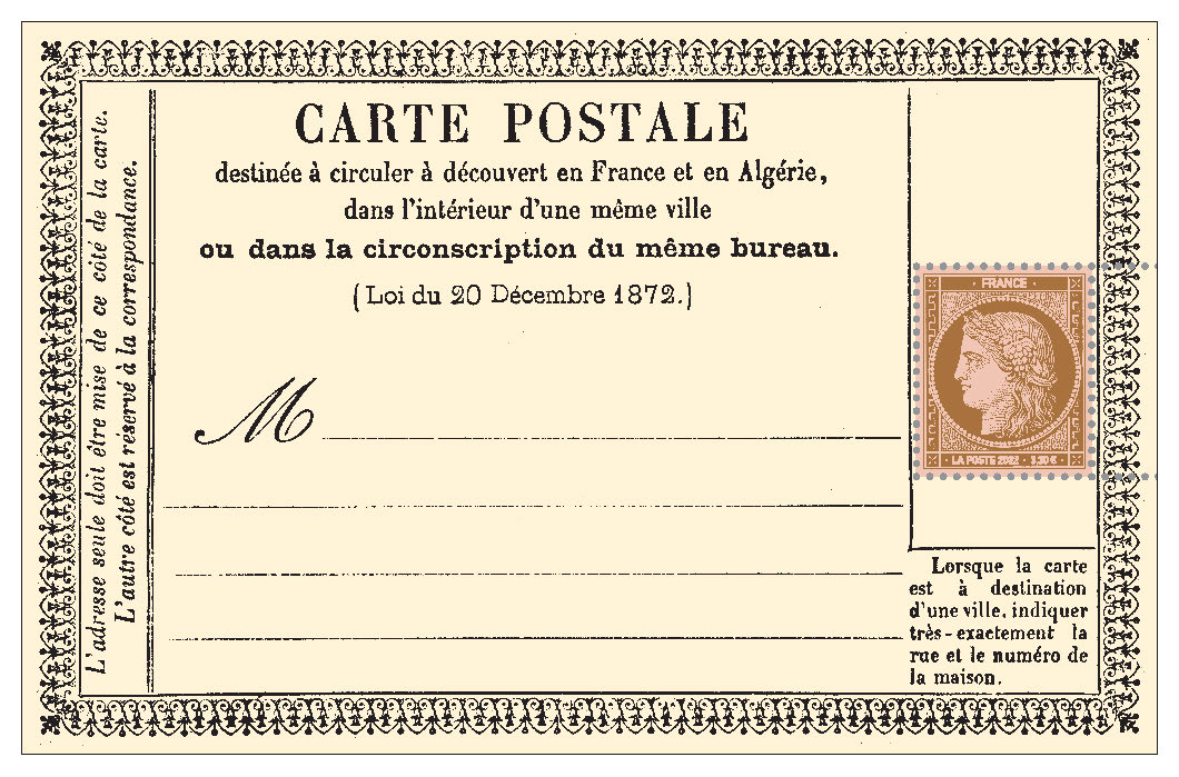 Le 20 décembre 1872, sur proposition du directeur des Postes Rampont-Léchin, une loi de finances officialise la naissance de la carte postale en France. Les premières cartes circulent le 15 janvier 1873 et rencontrent un succès foudroyant : en une semaine, il s’en vend 7 412 700 exemplaires.