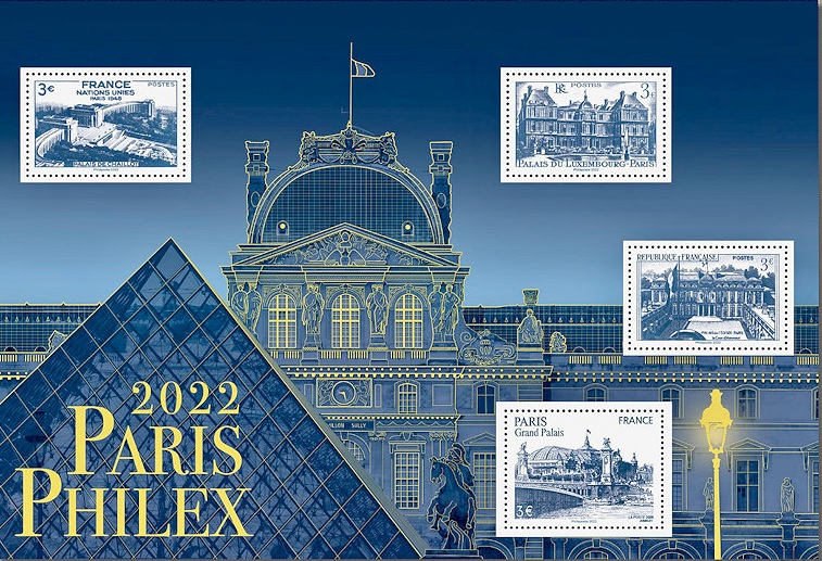 La Poste émet un bloc de 4 timbres à l’occasion de Paris-philex 2022. Les timbres de ce bloc sont des reproductions de timbres de 1947 émis à l’occasion du 12èmecongrès de l’UPU et représentant des monuments de Paris. Le fond du bloc représente la pyramide du Louvre.