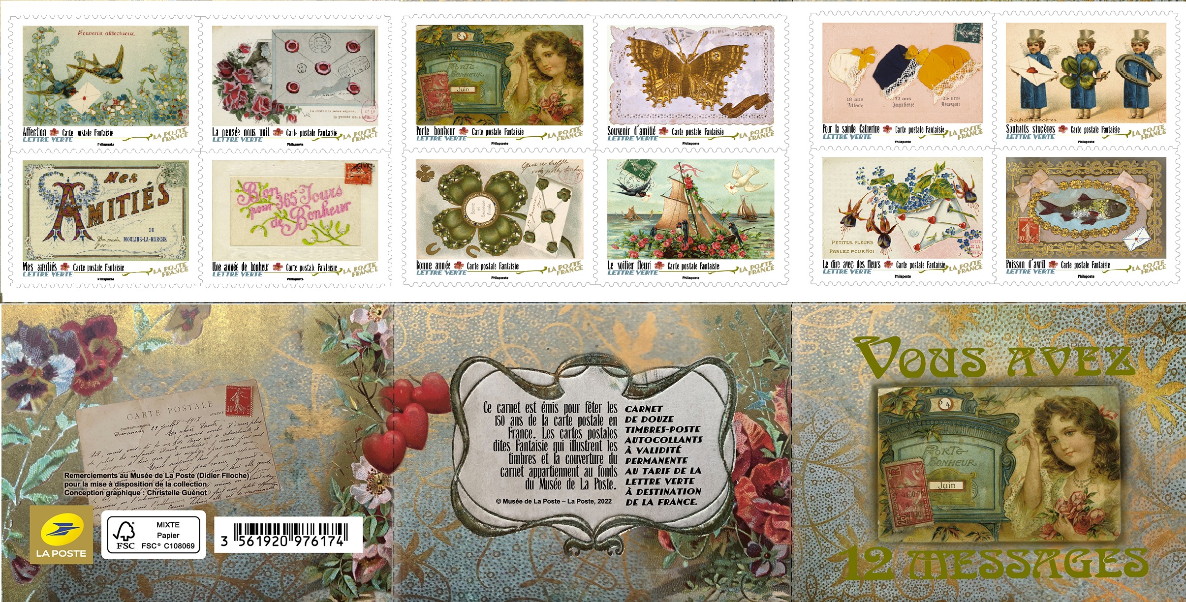 La Poste émet un carnet de collection de 12 timbres-poste autocollants, illustré par 12 cartes postales anciennes, dites « fantaisie » pour fêter les 150 ans de la carte postale en France.