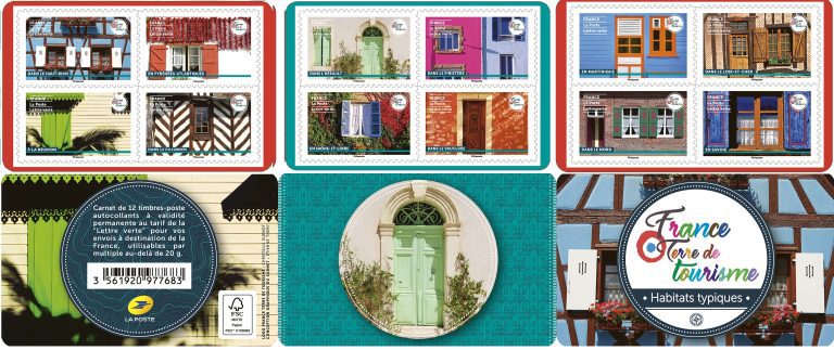 La Poste émet un carnet de 12 timbres-poste illustrés par des façades typiques d’habitats en France. Après le carnet émis en 2021 qui montrait la diversité des reliefs de nos régions, celui-ci attire l’attention sur la diversité des habitats. Encourageant le tourisme en France, la couverture et chaque timbre de ces carnets sont revêtus d’un logo original ‘France Terre de tourisme’.
