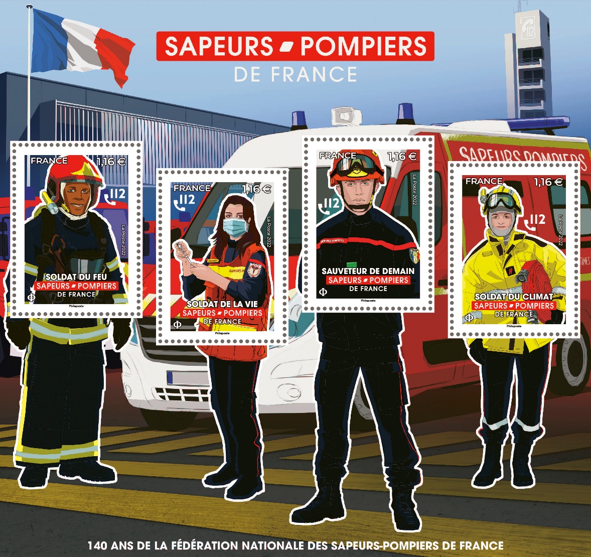 La Poste émet un bloc de timbres sapeurs-pompiers de France à l’occasion des 140 ans de la Fédération nationale.