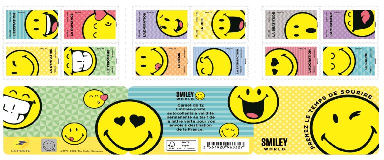 La Poste émet un carnet de 12 timbres-poste illustré par des Smiley à l’occasion des 50 ans de leur création.