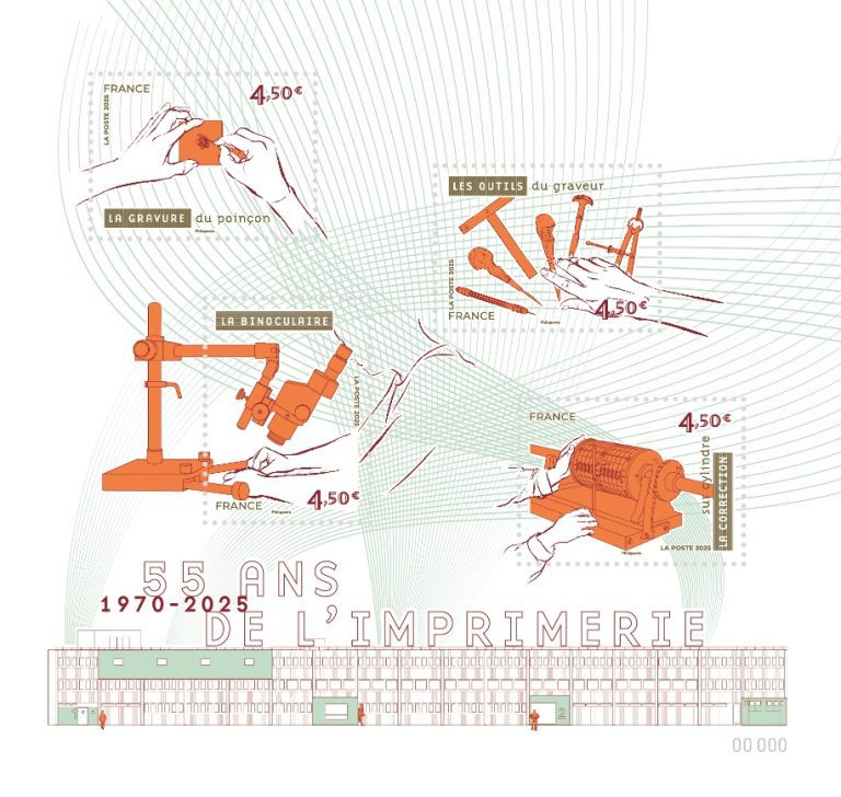 Cette année, l’imprimerie des timbres-poste et produits sécurisés fêtera les 55 ans de son installation à Boulazac, en Dordogne. Seul site de production de La Poste, elle a pour mission la fabrication et l’expédition des émissions philatéliques, l’affranchissement, la sûreté et la sécurité. À l’occasion de cet anniversaire, La Poste émettra en octobre prochain un bloc de 4 timbres illustrant les gestes de la gravure. On y découvre une imprimerie stylisée d’où s’échappent des volutes évoquant les traits gravés. Cette création graphique célèbre le savoir-faire unique du site, qui depuis des décennies imprime en taille-douce.