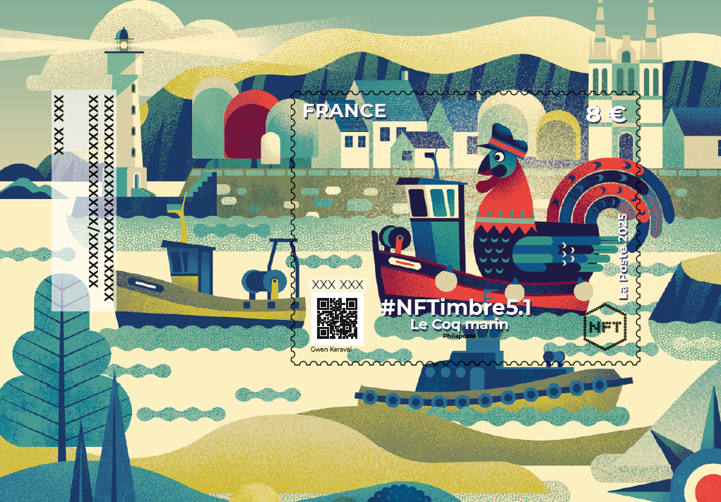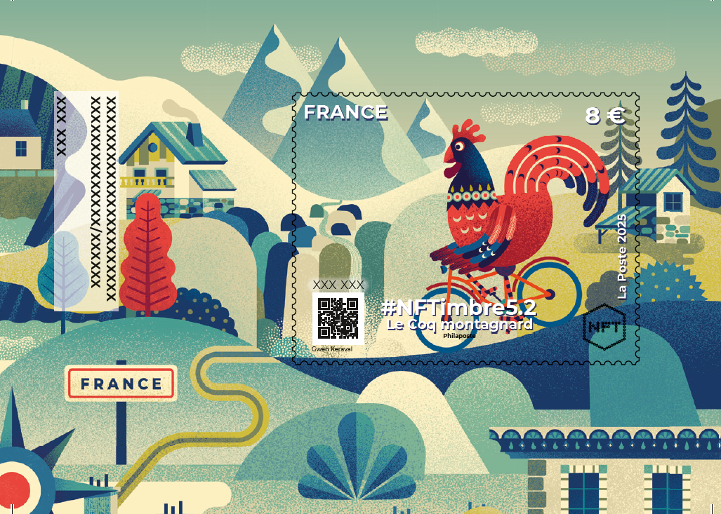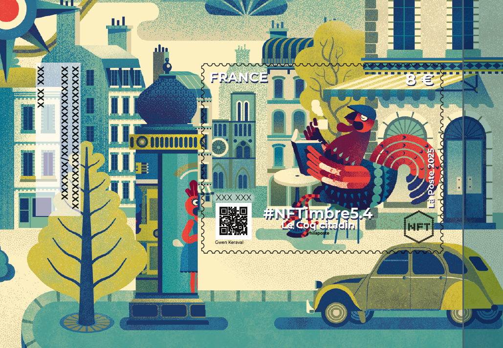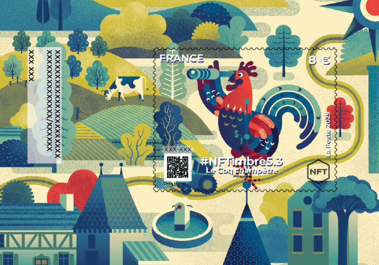 La Poste lance une nouvelle série #NFTimbre5 – Coqs français – confiée à l’illustrateur Gwen Keraval, qui met à l’honneur une interprétation à la fois symbolique et décalée du coq français, figure emblématique du patrimoine national.