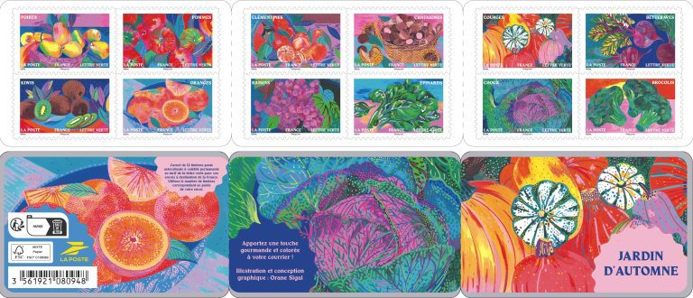 La Poste émet un carnet de 12 timbres poste, illustré par des fruits et des légumes d’automne qui apporteront une touche gourmande et colorée à vos courriers !