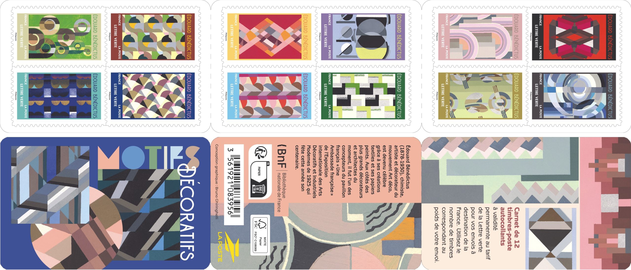 A l’occasion du centenaire des Arts décoratifs, La Poste émet un carnet de 12 timbres-poste illustré par des motifs décoratifs créés par Édouard Bénédictus et Jean Saudé et utilisés pour fabriquer des tissus et des papiers peints.