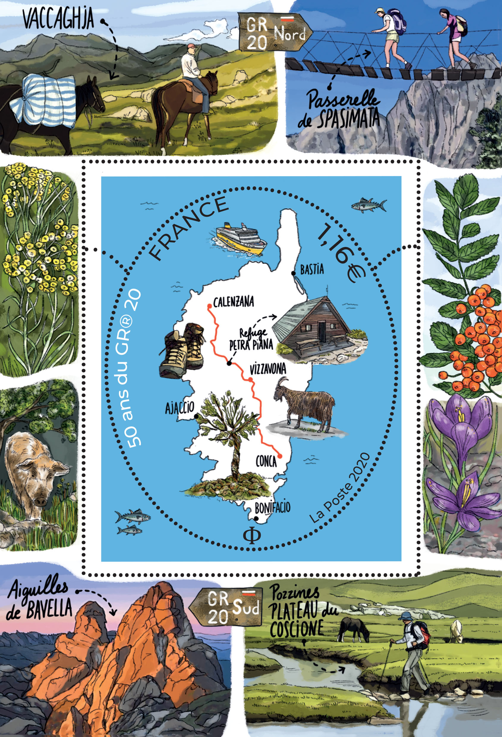 La Poste émet un bloc d’un timbre illustré par différentes étapes du plus fameux et plus sportif des sentiers de grande randonnée le GR® 20.