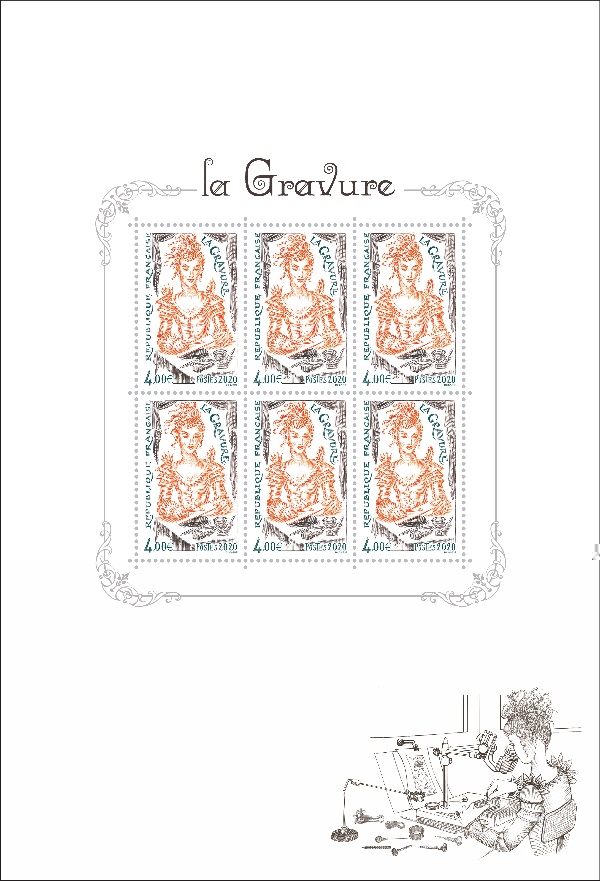 Ce bloc créé par Elsa Catelin, artiste graveur de l’imprimerie des timbres-poste de Boulazac reprend un timbre réalisé par le maitre graveur Albert Decaris (1901-1988) en 1984. Ce timbre mettait à l’honneur la gravure en taille-douce au féminin. Une femme aussi belle que raffinée, symbolise l’art de la gravure sur le timbre que l’administration des Postes consacrait cette année-là au travail des graveurs.