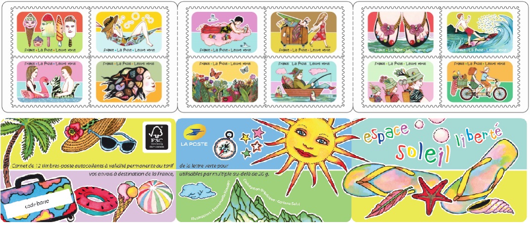 Les 12 timbres-poste du carnet « ESPACE, SOLEIL, LIBERTÉ » vous permettent de donner des nouvelles pendant l’été avec des timbres colorés, ensoleillés : vous faites du tandem, vous dégustez des glaces, vous êtes sur un nuage en lisant, dans vos rêves au bord de la mer, en détente en pêchant à la ligne, à la campagne parmi les fleurs et les papillons… Vous profitez du moment présent, vous retrouvez vous même. Quel bonheur ! Écrivez-le à vos proches !.