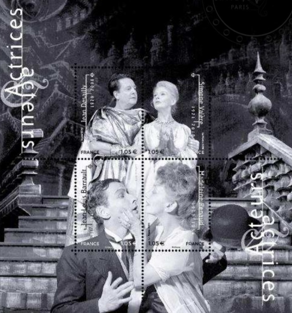 Le bloc est illustré par des photos de deux couples phares du théâtre français du 20ème siècle : Madeleine Renaud (1900-1994) et Jean-Louis Barrault (1910-1994) ainsi que Simone Valère (1921-2010) et Jean Desailly (1920-2008).