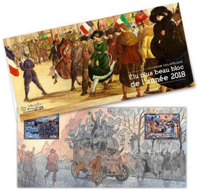 Lors de l’élection du timbre, le bloc de timbres « Centenaire de l’armistice du 11 novembre 1918 » a été primé plus beau bloc de l’année 2018. Un souvenir philatélique avec un dessin de Damien Cuvillier sur le feuillet, est émis à cette occasion.