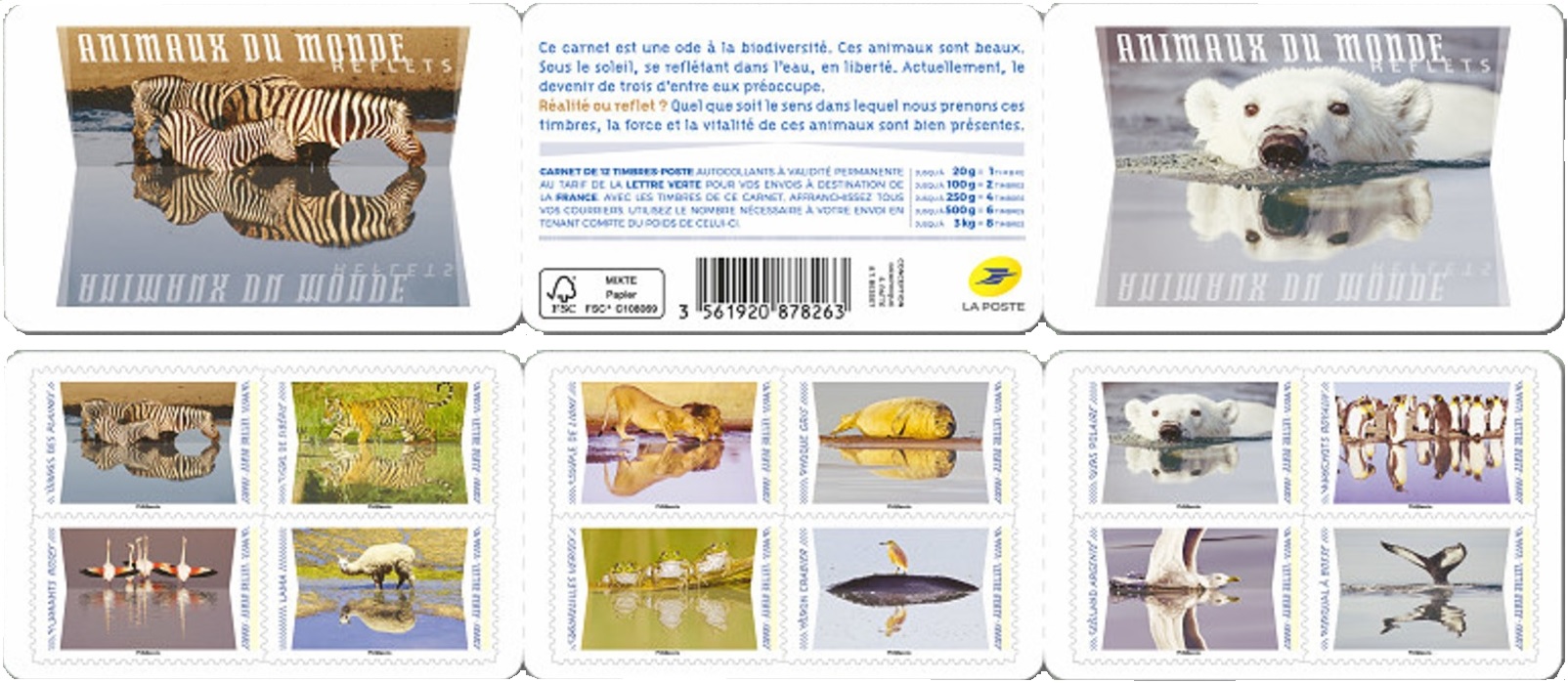 Ce carnet est une ode à la biodiversité. Douze espèces sont représentées, les zèbres des plaines, le tigre de Sibérie, un couple de lions, le phoque gris, l’ours polaire, les manchots royaux, les flamants roses, le lama, les grenouilles vertes, le héron crabier, le goéland argenté et le rorqual à bosse. Ces animaux sont majestueux, sous le soleil, se reflétant dans l’eau ou en liberté. Reflet ou réalité, l’effet miroir donne la pleine plénitude d’un moment… Quel que soit le sens dans lequel nous prenons ces timbres, la force et la vitalité de ces animaux sont bien présentes.