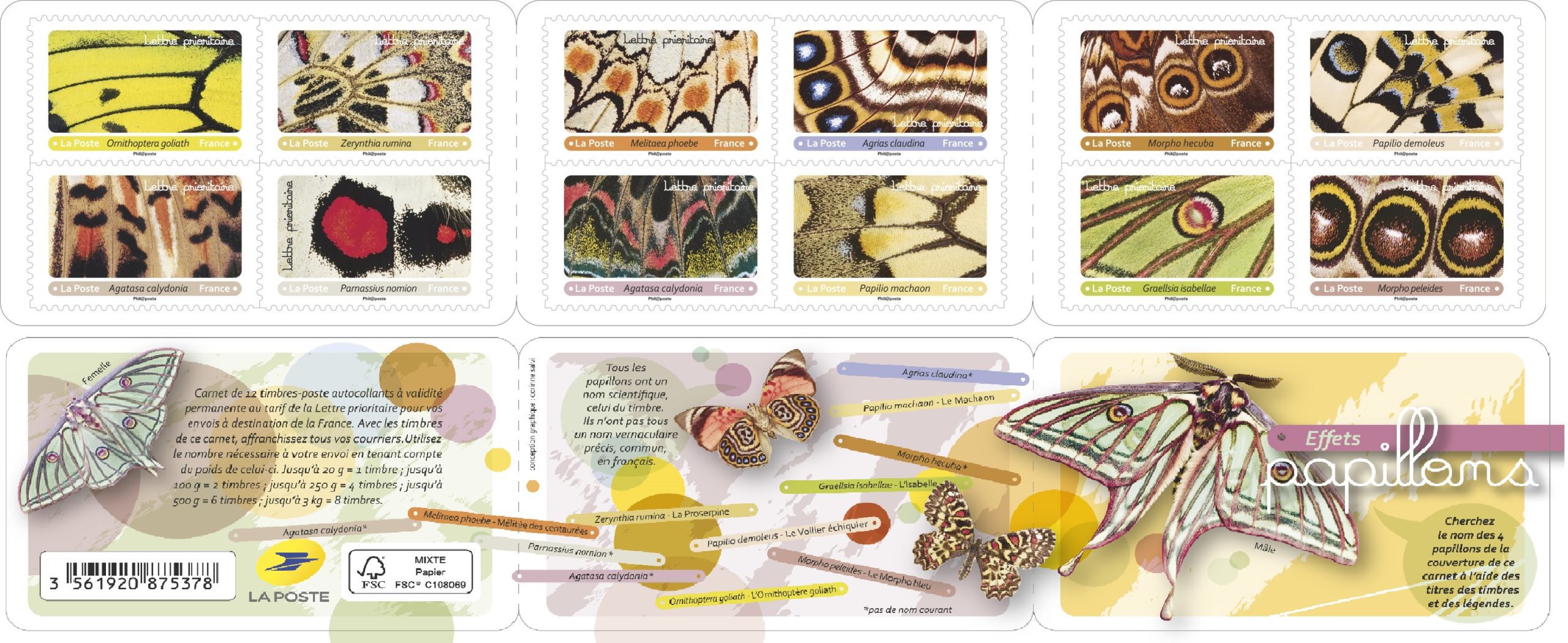 La Poste émet un carnet de 12 timbres-poste illustré par des détails d’ailes de papillons.