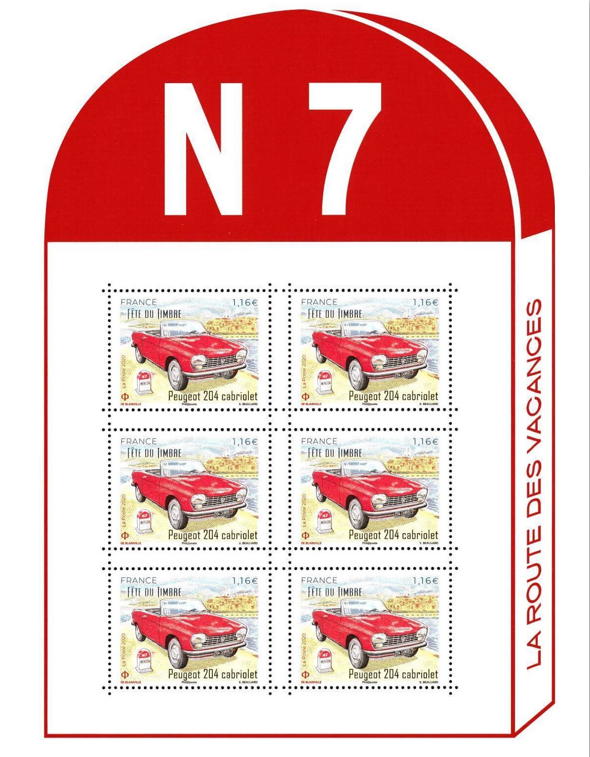 Pour l’illustrer un timbre représentant une 204 Peugeot cabriolet avec, en fond Menton, étape ultime de la mythique N7, et un bloc représentant une Peugoet 404 trainant une caravane seront mis en vente les 28 et 29 mars dans une centaine de villes.