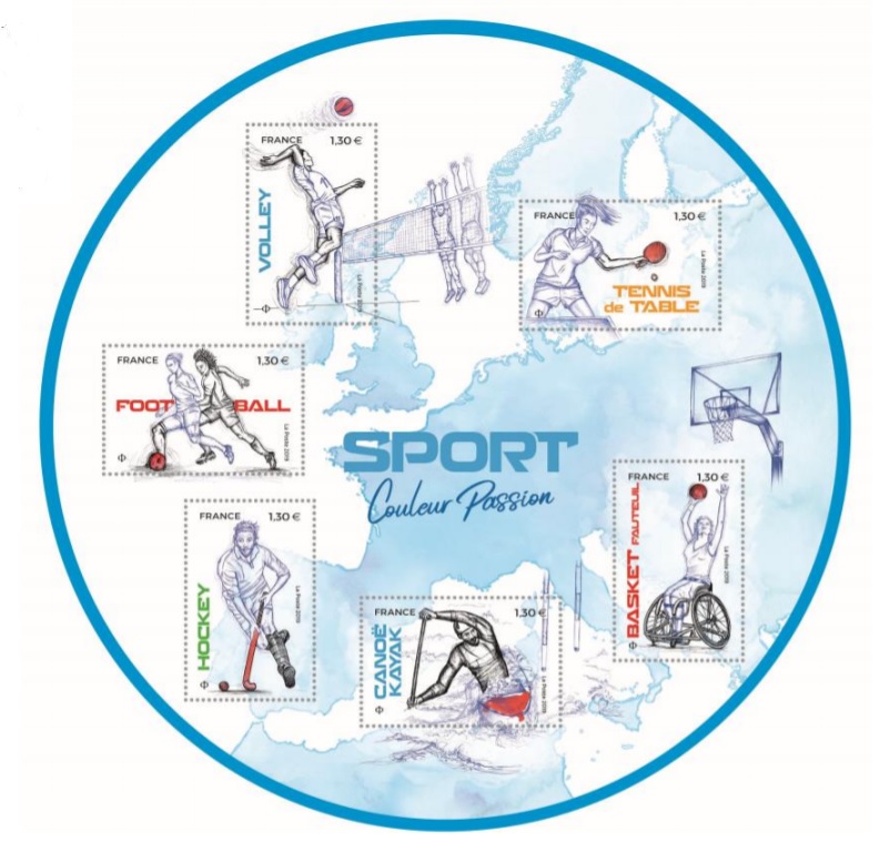 La Poste émet un bloc de 6 timbres mettant en scène une nouvelle série sur le sport pendant une durée de 5 ans. La France est mise à l’honneur en 2019 avec 6 disciplines sportives : le basket, le canoë-kayak, le football, le hockey, le tennis de table et le volley.