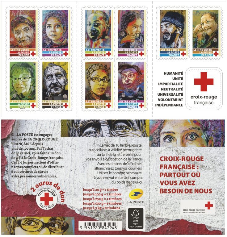 La Poste émet un carnet de 10 timbres-poste « CroixRouge française » illustrés de visages réalisés au pochoir par l’artiste C215.