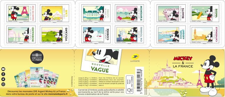 Dans le cadre d’une année d’enthousiasme, avec Mickey et les célébrations de son 90ème anniversaire et ses liens privilégiés avec le public français, La Poste émet un carnet de 12 timbres-poste. Ces timbres malicieux font (re)découvrir à travers l’œil enthousiaste de Mickey lors de ses vacances, des monuments et des lieux emblématiques de nos régions.