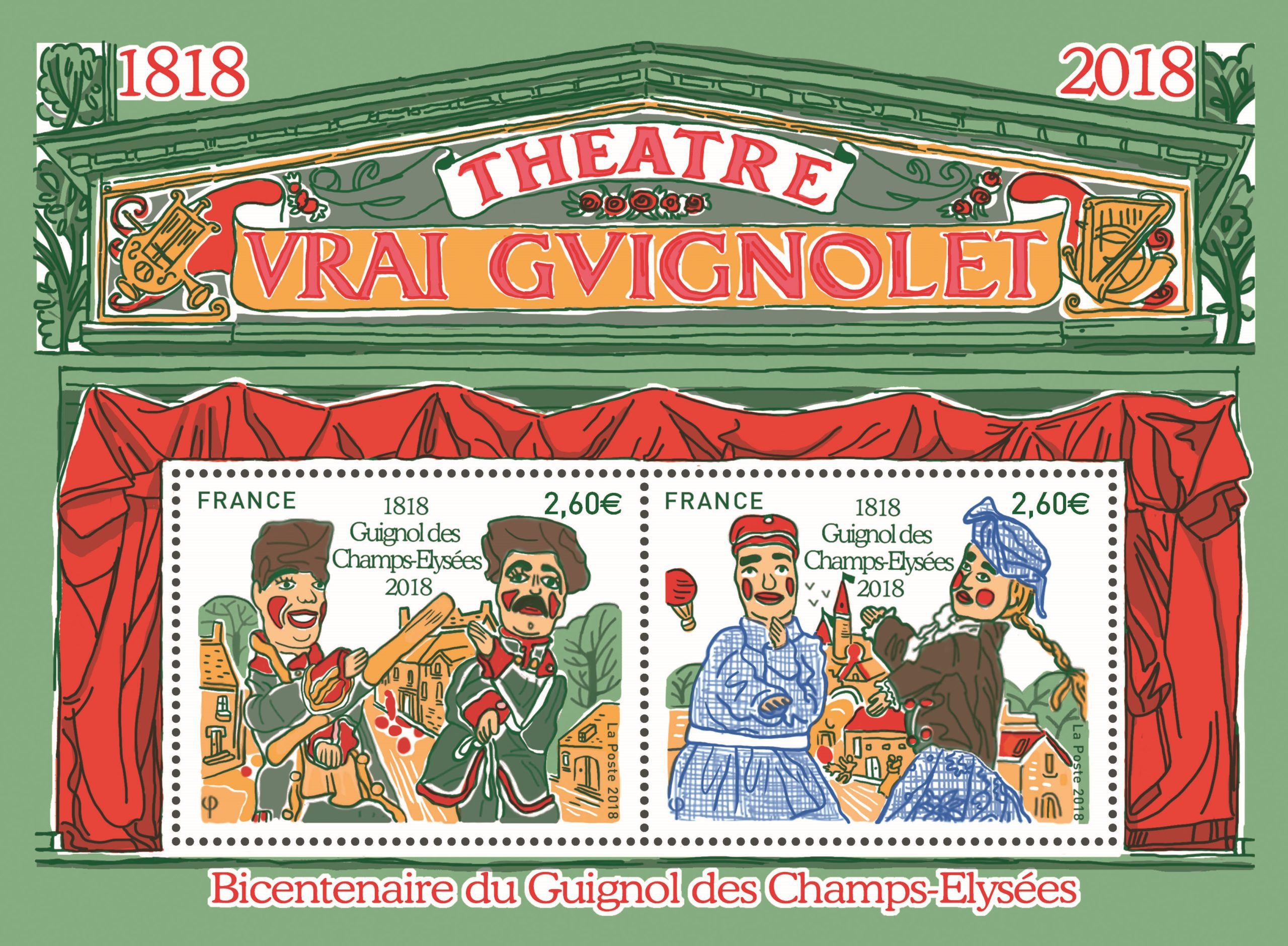 Le bloc de timbres représente de manière ludique le théâtre du Guignol et intègre dans l’espace de représentation, les deux timbres avec les marionnettes. Ceux-ci peuvent être détachés de la scène pour venir s’animer derrière le fond du bloc, ainsi ajouré.
