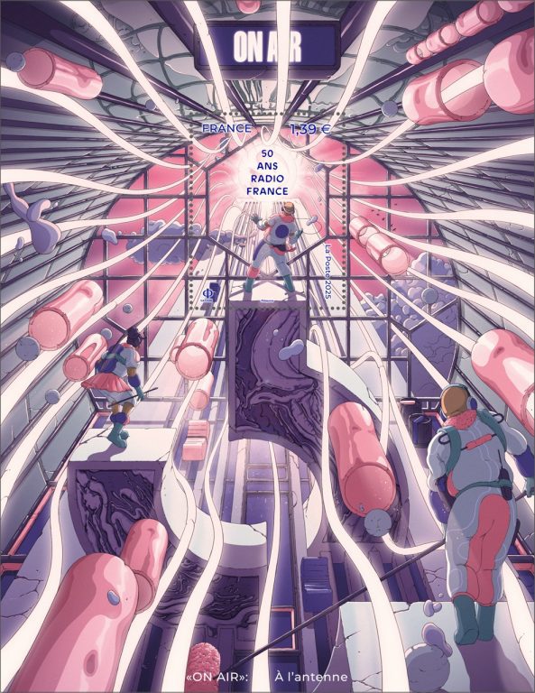 La radio et la musique personnifiées surfant sur l’écoutille, signe distinctif du logo de Radio France, entourées d’ondes. Un auditeur face à une oreille incandescente, symbole de l’écoute, au cœur d’une France stylisée. Et la célèbre Maison de la Radio et de la Musique comme terrain de jeu. C’est à travers ces marqueurs forts et son univers fantasmagorique qu’Ugo Gattoni illustre l’entreprise Radio France sur ce timbre célébrant ses 50 ans.