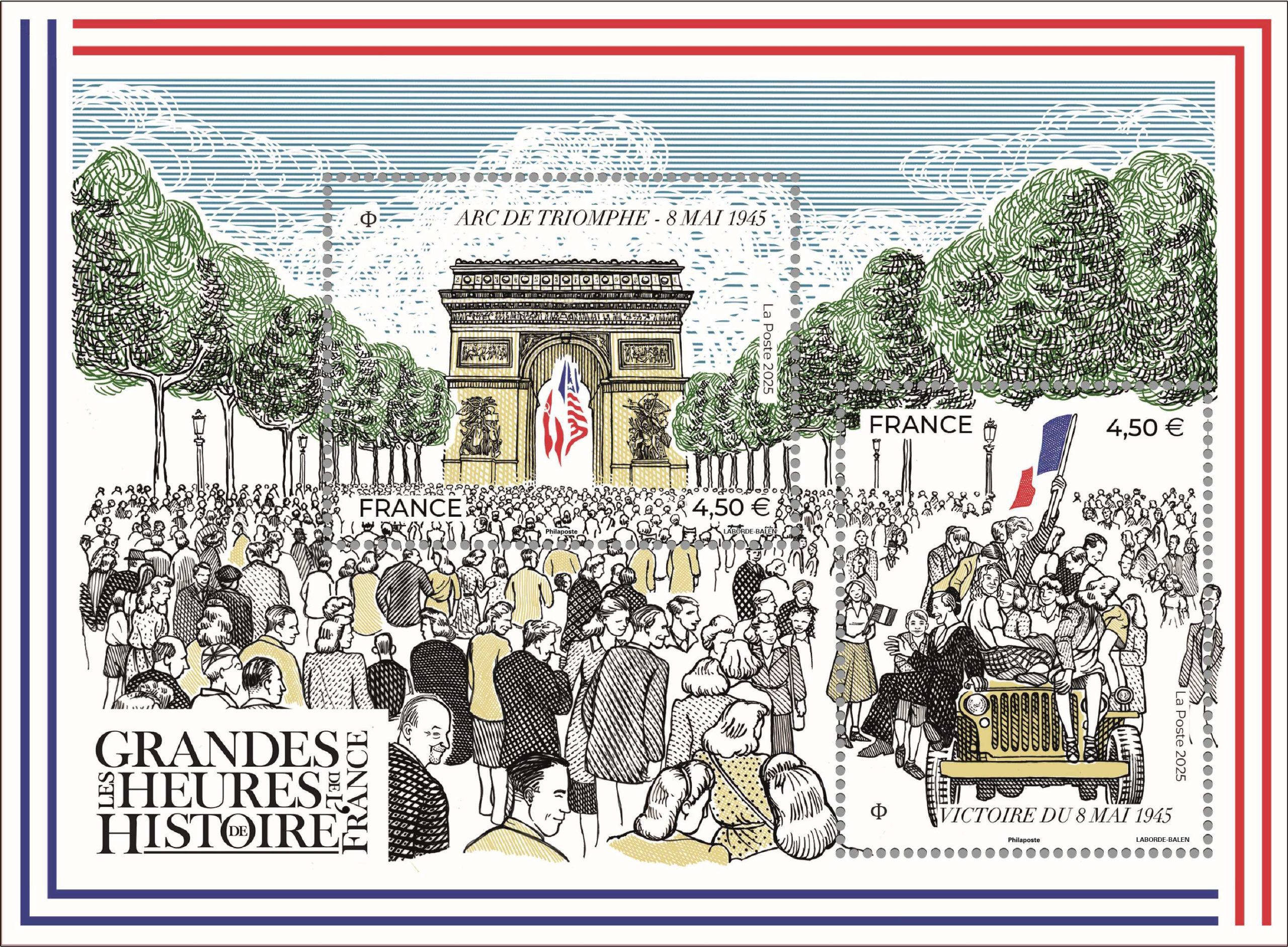 La Poste émet un bloc de la série les Grandes Heures de l’Histoire de France, illustré par deux timbres qui célèbrent les 80 ans de la Victoire du 8 mai 1945.