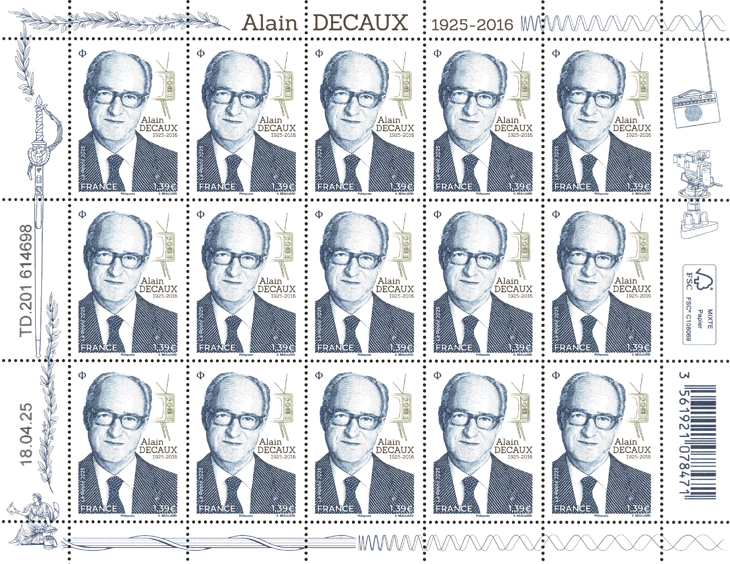 La Poste émet un timbre à l’effigie d’Alain Decaux, historien, écrivain, journaliste et homme de télévision français, élu à l’Académie française en 1979, à l’occasion du centenaire de sa naissance.