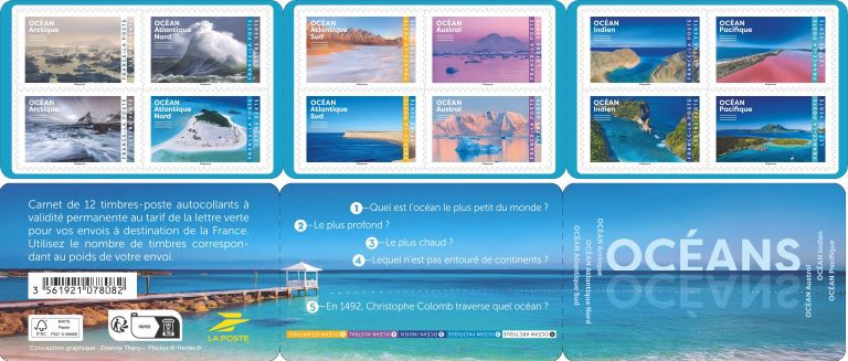 La Poste émet un carnet de douze timbres-poste, illustré par des photographies des océans.