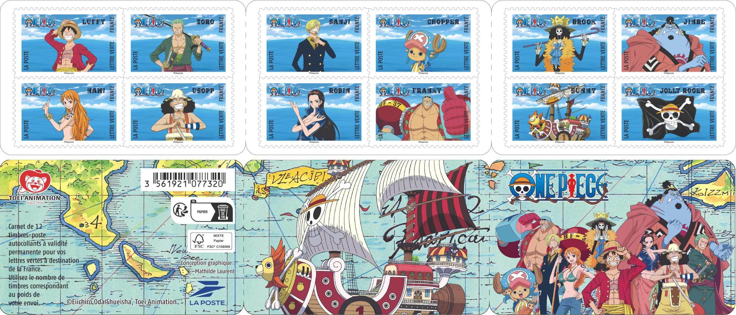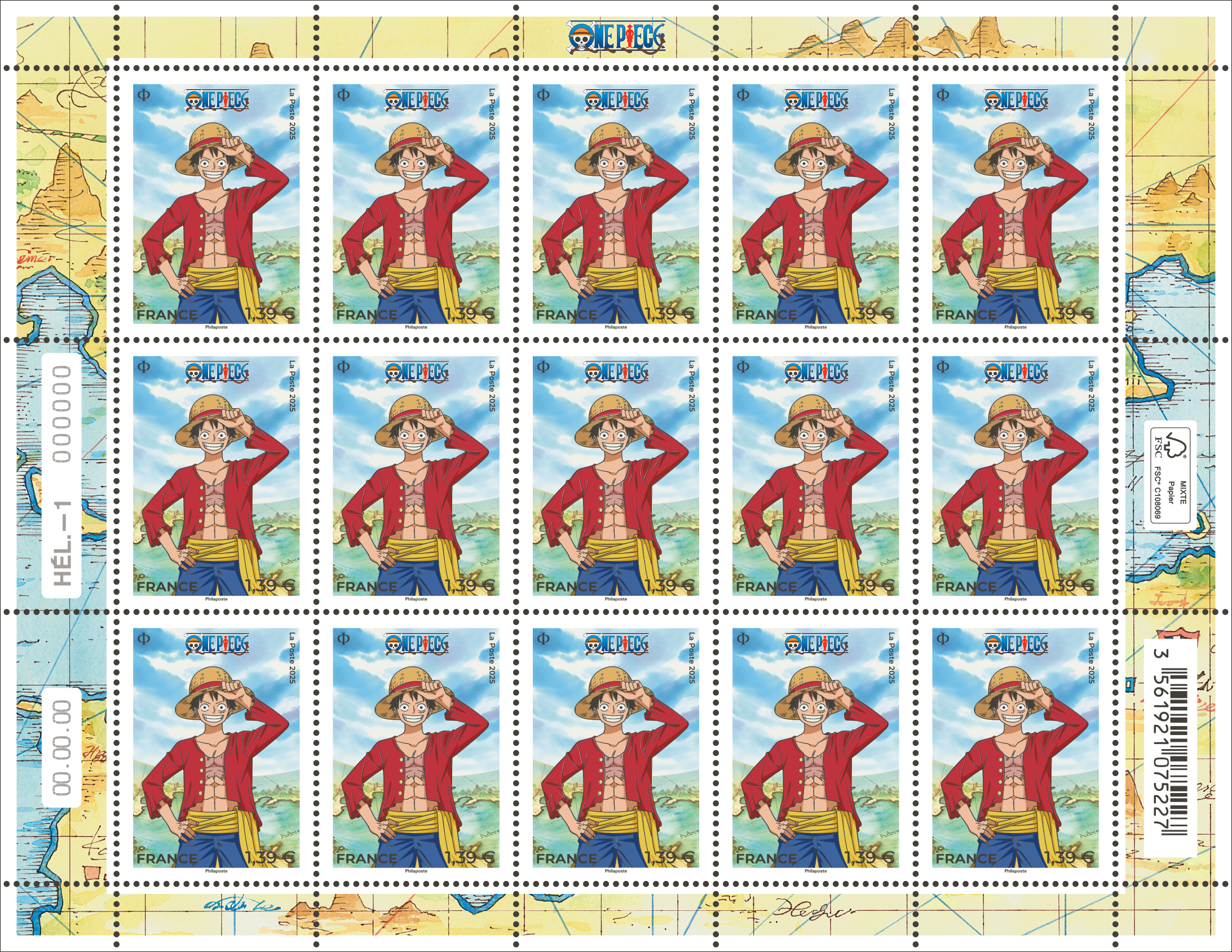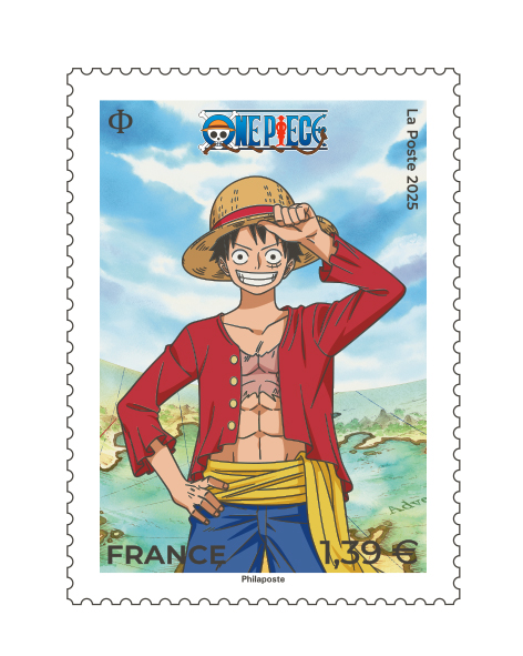 Pour célébrer cet univers fascinant, La Poste émet un timbre mettant à l’honneur Luffy, un carnet de 12 timbres autocollants illustrant les membres de l’équipage de Chapeau de Paille ainsi que leur célèbre navire, le Thousand Sunny ; et un collector de 4 timbres « Les quatre nouveaux empereurs ».