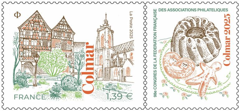 En 2025, Colmar accueille le 98ème congrès de la Fédération française des associations philatéliques comme le rappelle la vignette attenante au timbre. Celle-ci évoque un autre trésor régional : les spécialités gourmandes, de l’emblématique kouglof aux petits pains d’épice en passant par les bretzels.
