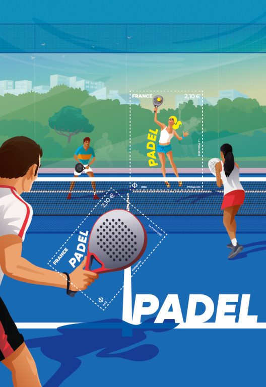 La Poste émet un bloc dans la série Sport composé de deux timbres sur le padel. C’est un mélange de tennis et de squash, joué en double sur un terrain plus petit qu’un court de tennis et entouré de murs en verre et en grillage. En France le padel est en plein essor depuis le début des années 2000.