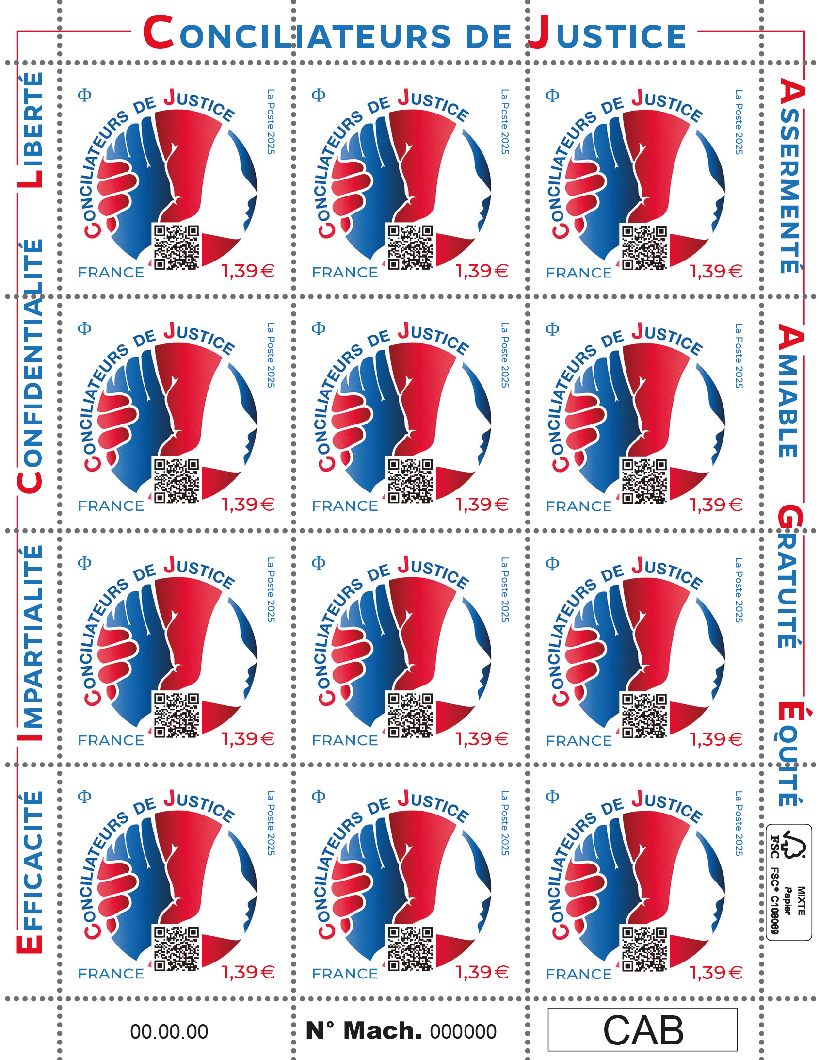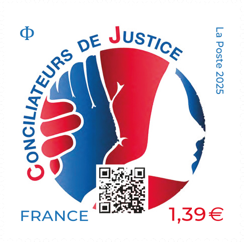 Le timbre « Conciliateurs de justice » intègre un code QR permettant d’accéder directement au site des conciliateurs. Ce site permet la saisie en ligne d’une demande de conciliation au plus près de chez vous.