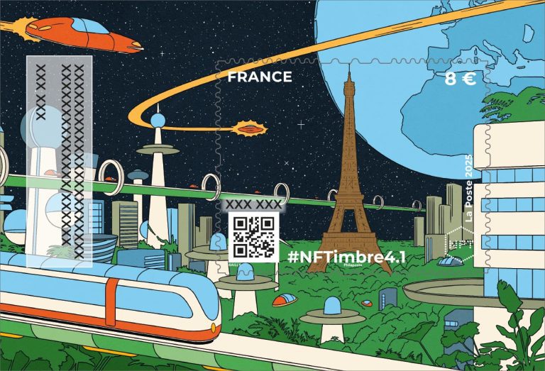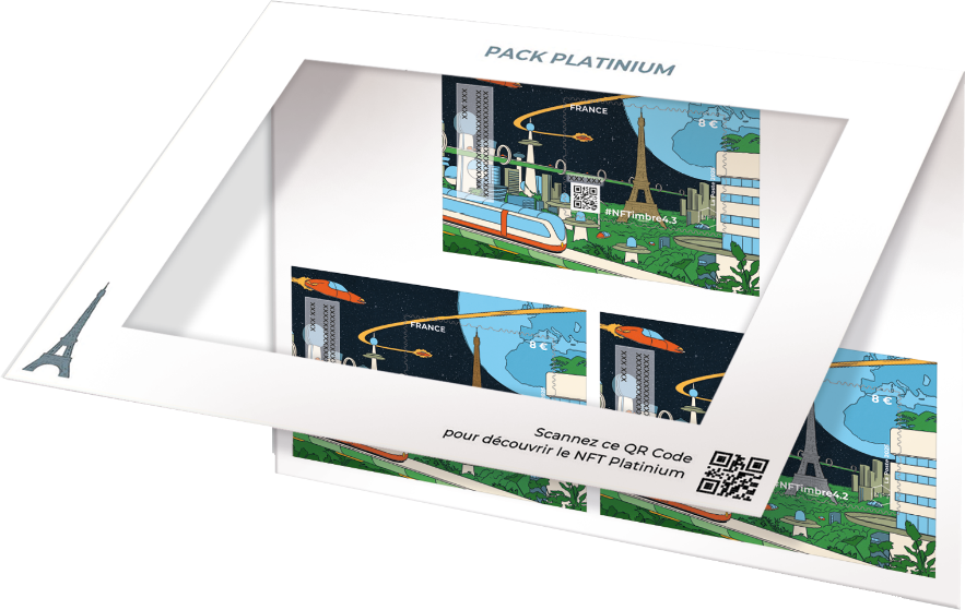 Sur le #NFTimbre4.1 la tour Eiffel se teinte en bronze, sur le #NFTimbre4.2 elle s’orne d’argent et sur le #NFTimbre4.3 elle se pare en or. Chaque NFTimbre est composé de 2 produits : un bloc d’un timbre numéroté et son NFT associé.