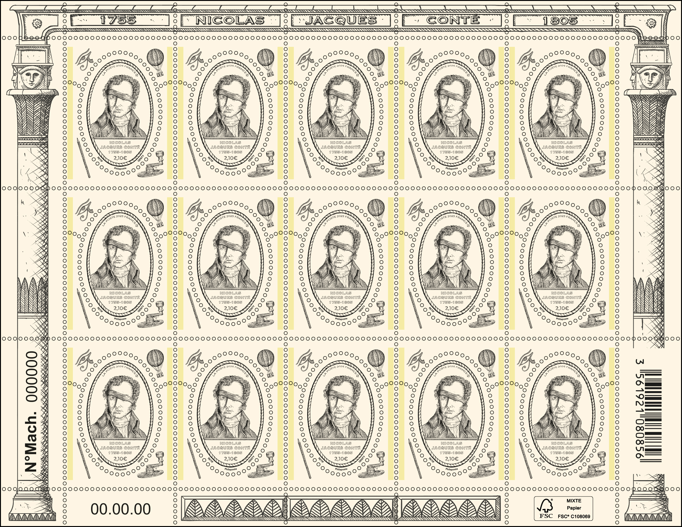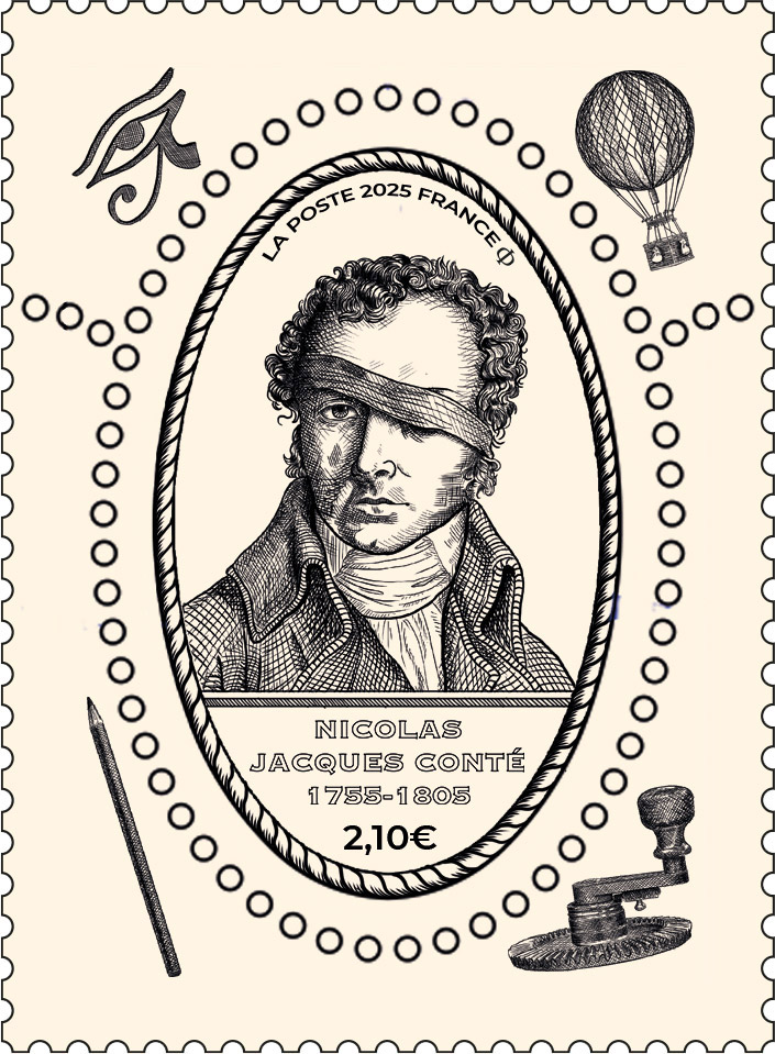 La Poste émet un timbre à l’effigie de Nicolas Jacques Conté, physicien et chimiste français, connu pour avoir inventé le crayon à mine artificielle.