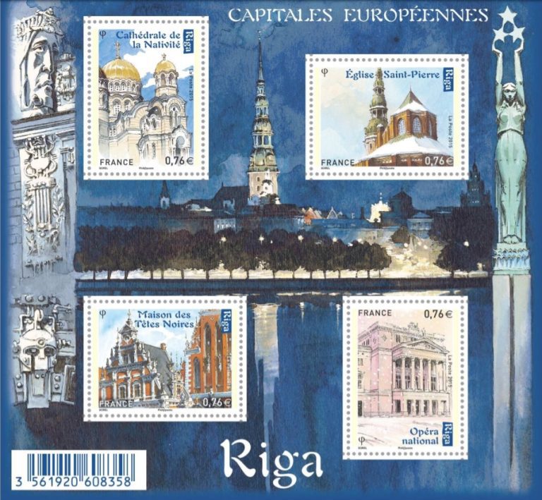 Riga, capitale de la Lettonie, est inscrite au patrimoine mondial de l’UNESCO depuis 1997. De nombreuses rues comportent des immeubles et hôtels de style Art Nouveau, dont certains détails sont représentés sur le bloc.