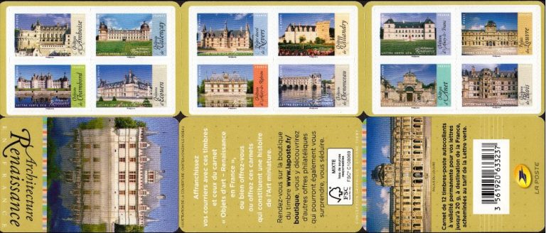 Les timbres et la couverture de ce carnet sont illustrés par des monuments de l’époque de la Renaissance en France, essentiellement des châteaux.