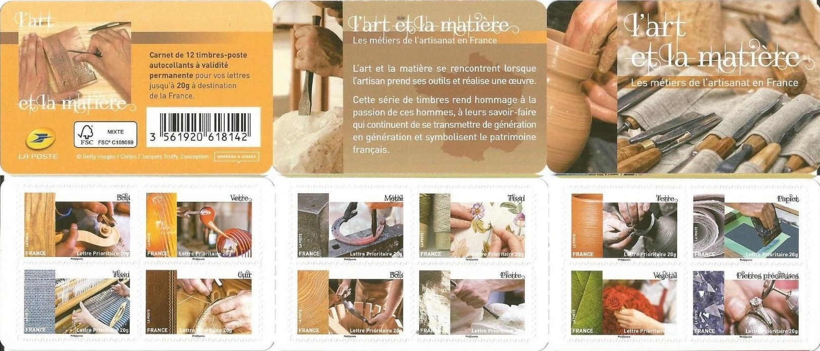 Cette série de timbres rend hommage à la passion des artisans et à leurs savoir-faire qui se transmettent de génération en génération, en symbolisant le patrimoine français.