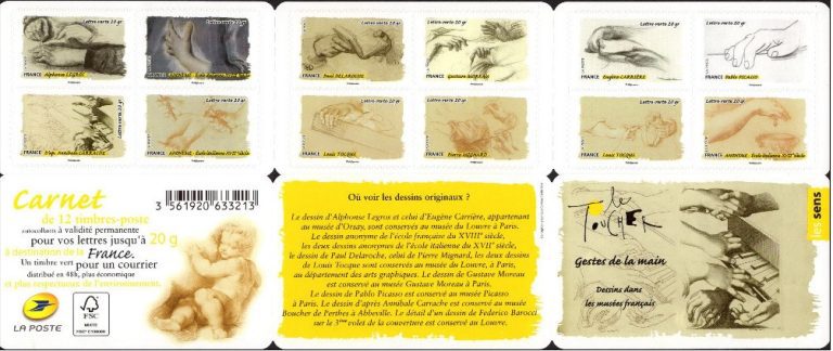 Pour illustrer le sens du toucher sur des timbres, le choix du dessin a tout son « sens ». Il est à l’origine de la préparation de l’œuvre peinte ou du carton de tapisserie. La main guide le crayon sur des supports papiers divers, qu’il serait agréable de toucher si cela ne les endommageait pas. Mais l’œil peut sentir aussi la texture du papier. La fragilité du papier est encore accentuée par les matériaux utilisés, qui laissent aussi des traces « fragiles ».